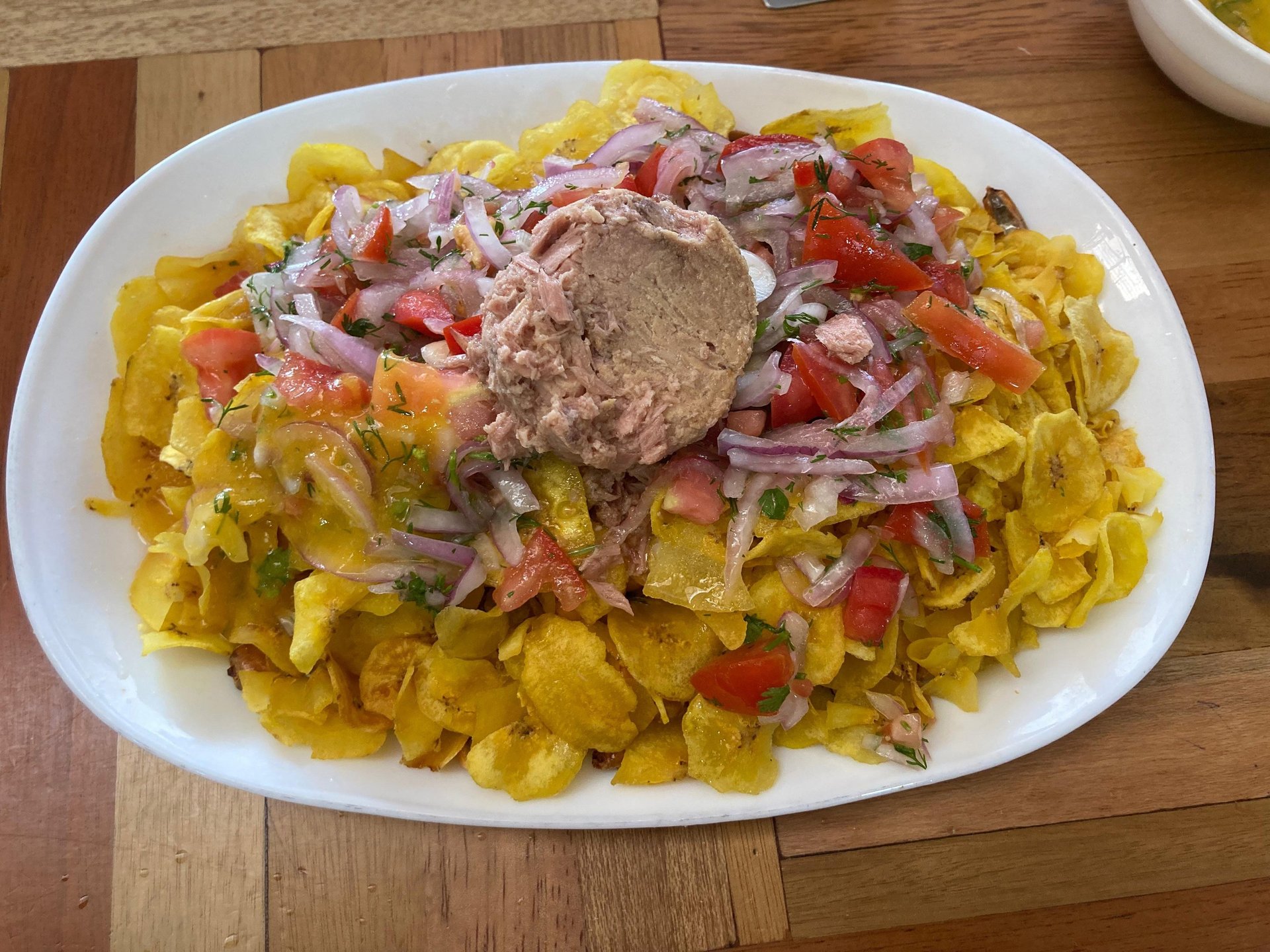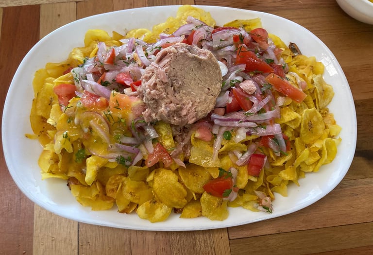 The volquetero is the most famous dish in Puyo, with an interesting origin story. According to locals, it was created by construction workers ("volqueteros") who needed a quick, high energy meal during their long shifts. The dish is a delicious mix of chochos (lupin beans), tuna, plantain chips, onions, and tomatoes, all topped with a special tree tomato sauce that is mild and flavorful.